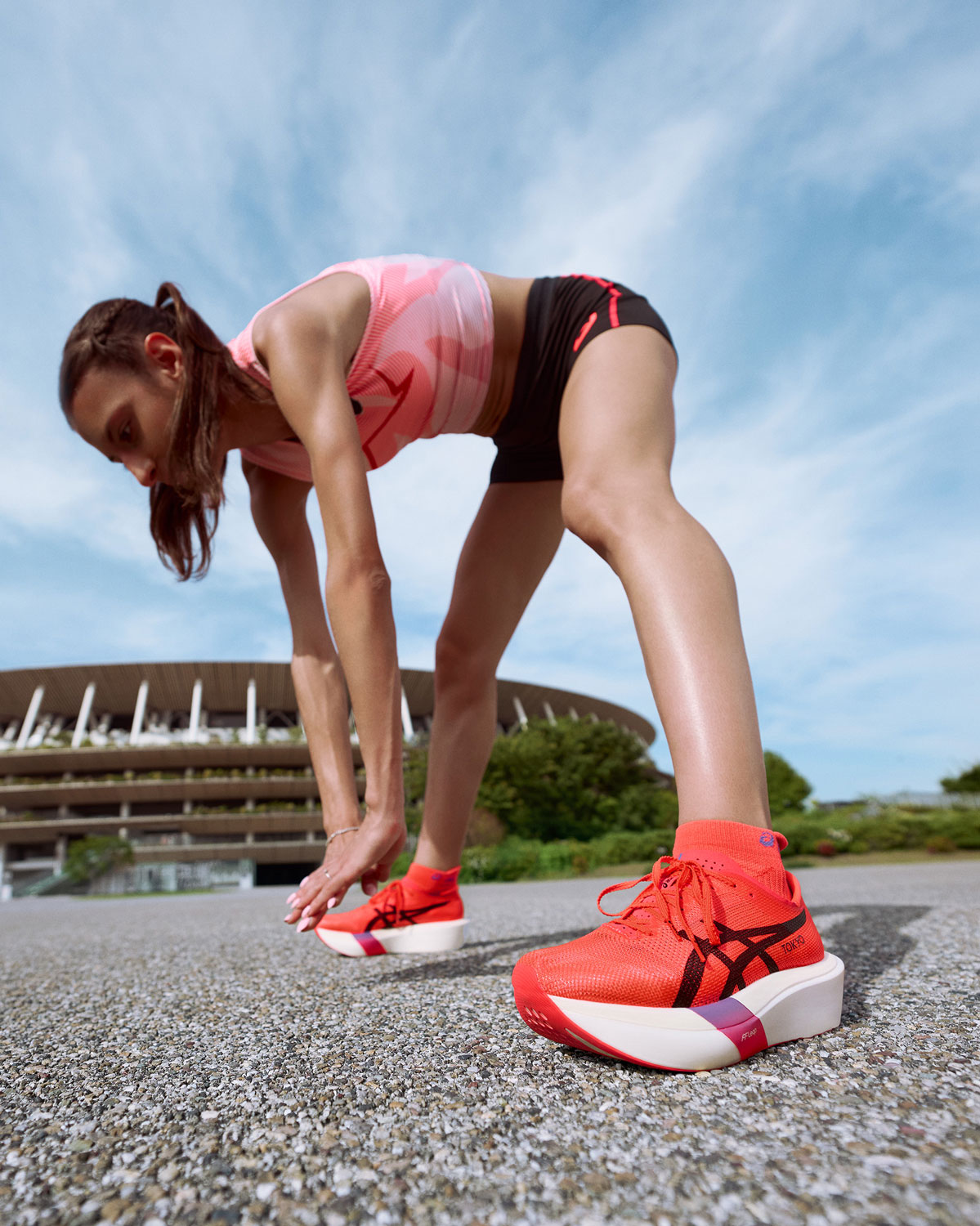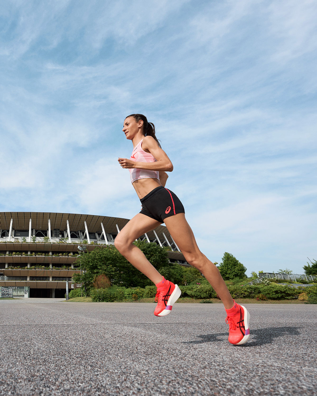 The Metaspeed series returns to the racing supershoe scene with the new Tokyo capsule, featuring a vibrant red that celebrates Asics' Japanese roots and its extraordinary sporting heritage. Already a staple on the feet of athletes like Nadia Battocletti and Pietro Riva, the Metaspeed Sky Tokyo and Metaspeed Edge Tokyo cater to two different running styles, both capable of pushing runners beyond their limits with propulsive speed. Completing the look are lightweight, high-performance apparel with an exclusive design inspired by the collection's dynamism.