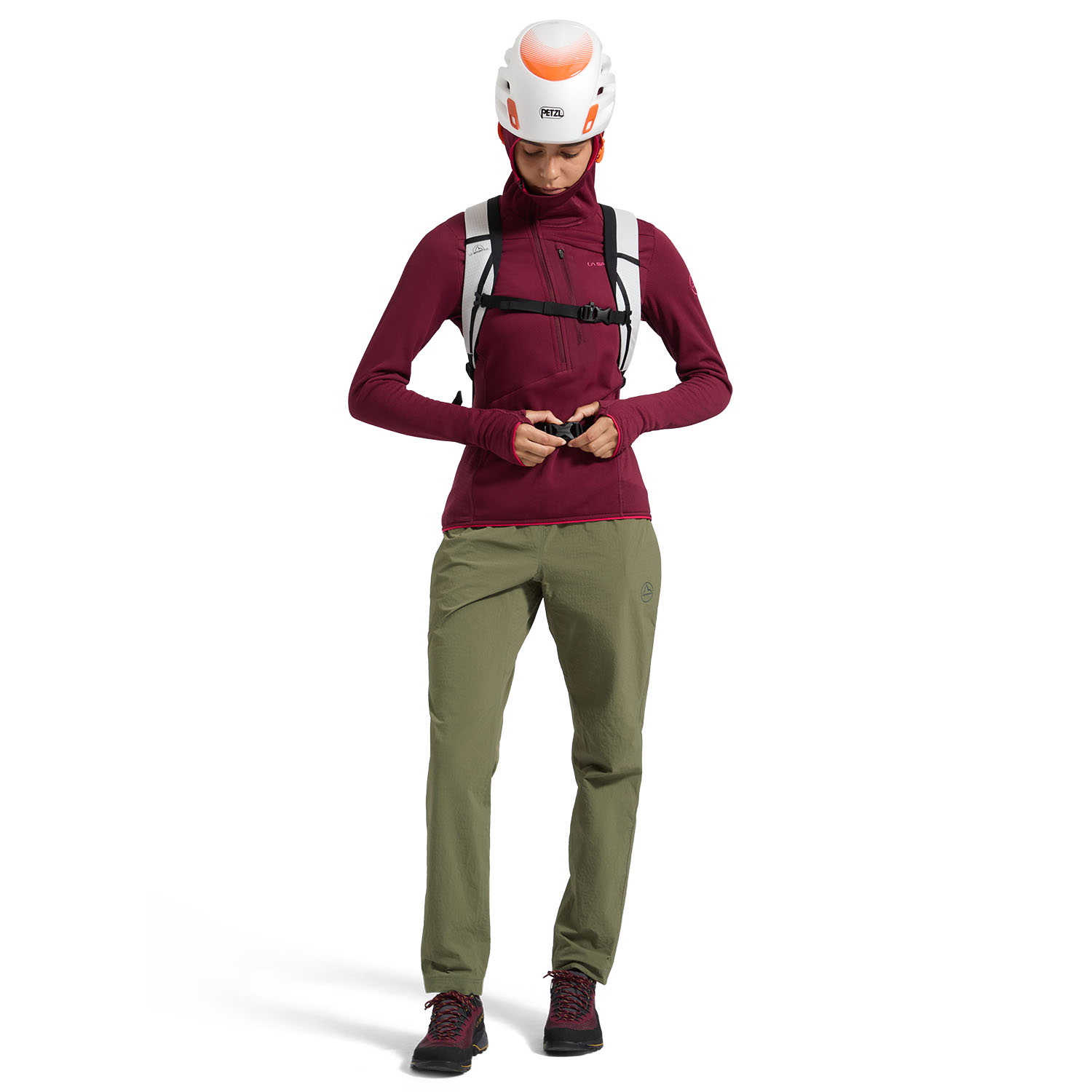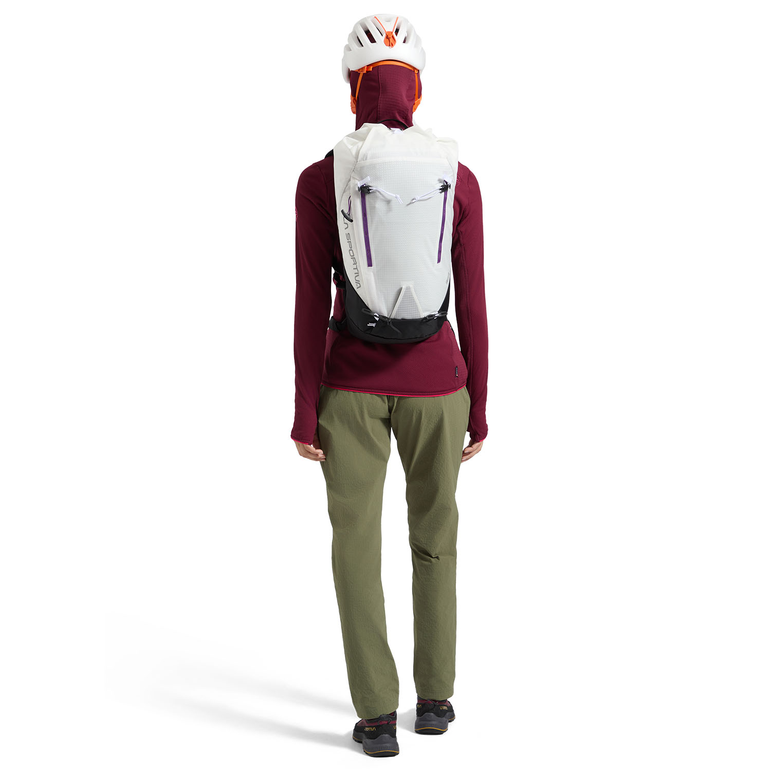 • Main compartment with dual access: top opening with adjustable drawstring and side zip for quick access. Adjustable hood with cord attachment system.
