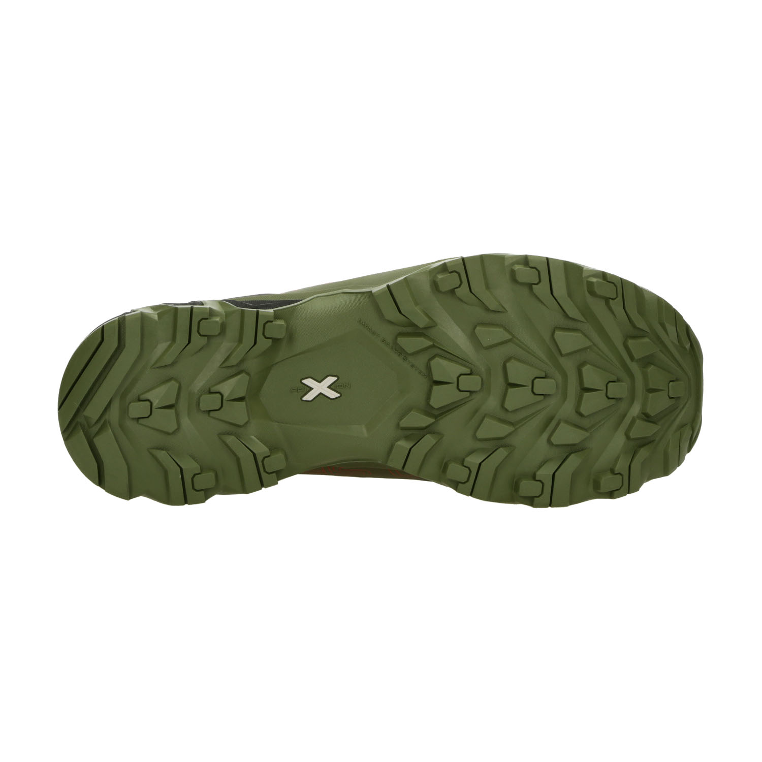 Innovative system applied to the sole that absorbs impact, helps in traction and holds back when braking. The particular arrangement of the knobs ensures that some of them come into contact with the ground first, softening the support of the tread.