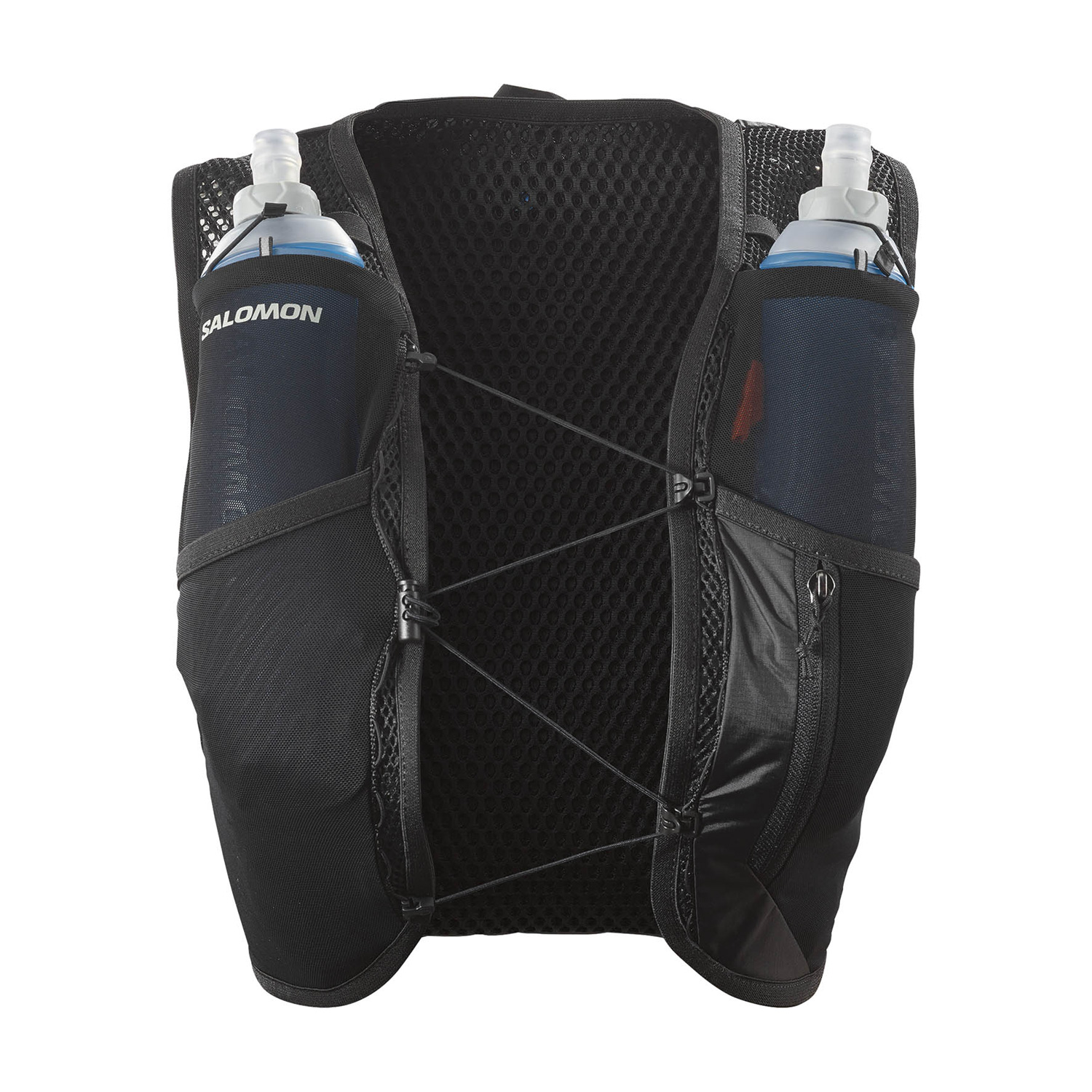 The Salomon Active Skin 4 Set women's trail running backpack is made from soft, breathable fabrics, provides an ultra-stable fit adapted to a woman's body shape, and features revised chest pockets for easy access to flasks.
