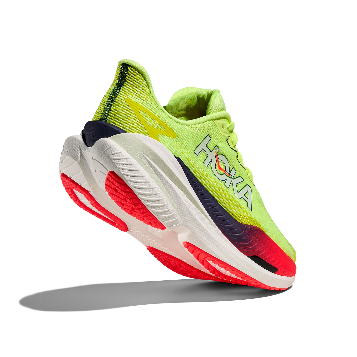 La poca diferencia entre talón y punta, la entresuela con su forma única y el exclusivo rodamiento HOKA, facilitando una zancada suave y fluida desde el apoyo hasta el despeje en el ciclo natural del paso del corredor.