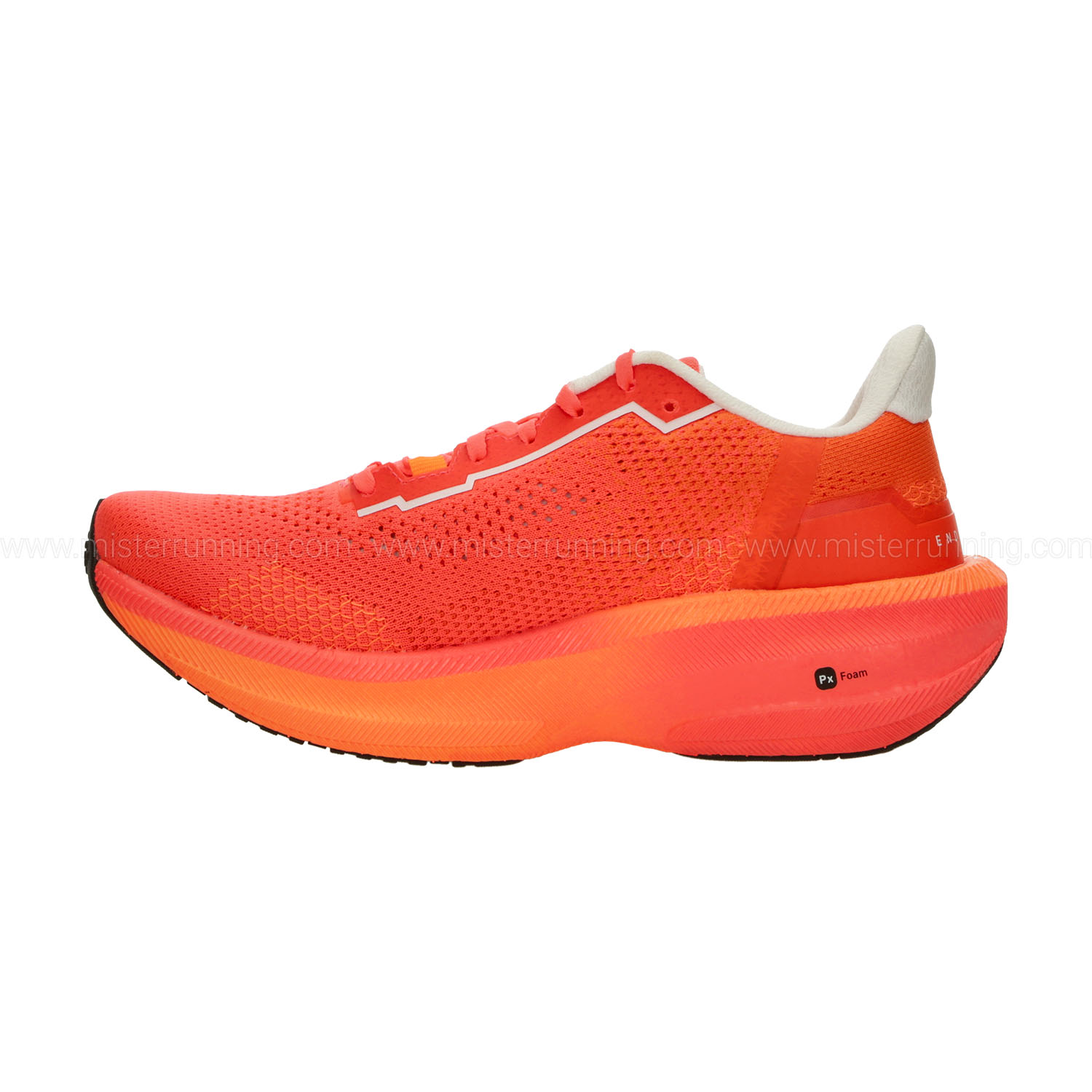La tomaia monopezzo in engineered mesh, altamente traspirante, avvolge e sostiene il piede assicurando comfort e stabilità. L’intersuola in mescola Px Foam, grazie alla sua elevata flessibilità, combina un eccellente ritorno di energia con un assorbimento ottimale degli impatti, offrendo atterraggi morbidi e una spinta energica. La suola in gomma ad alta resistenza garantisce un'aderenza costante sull’asfalto.