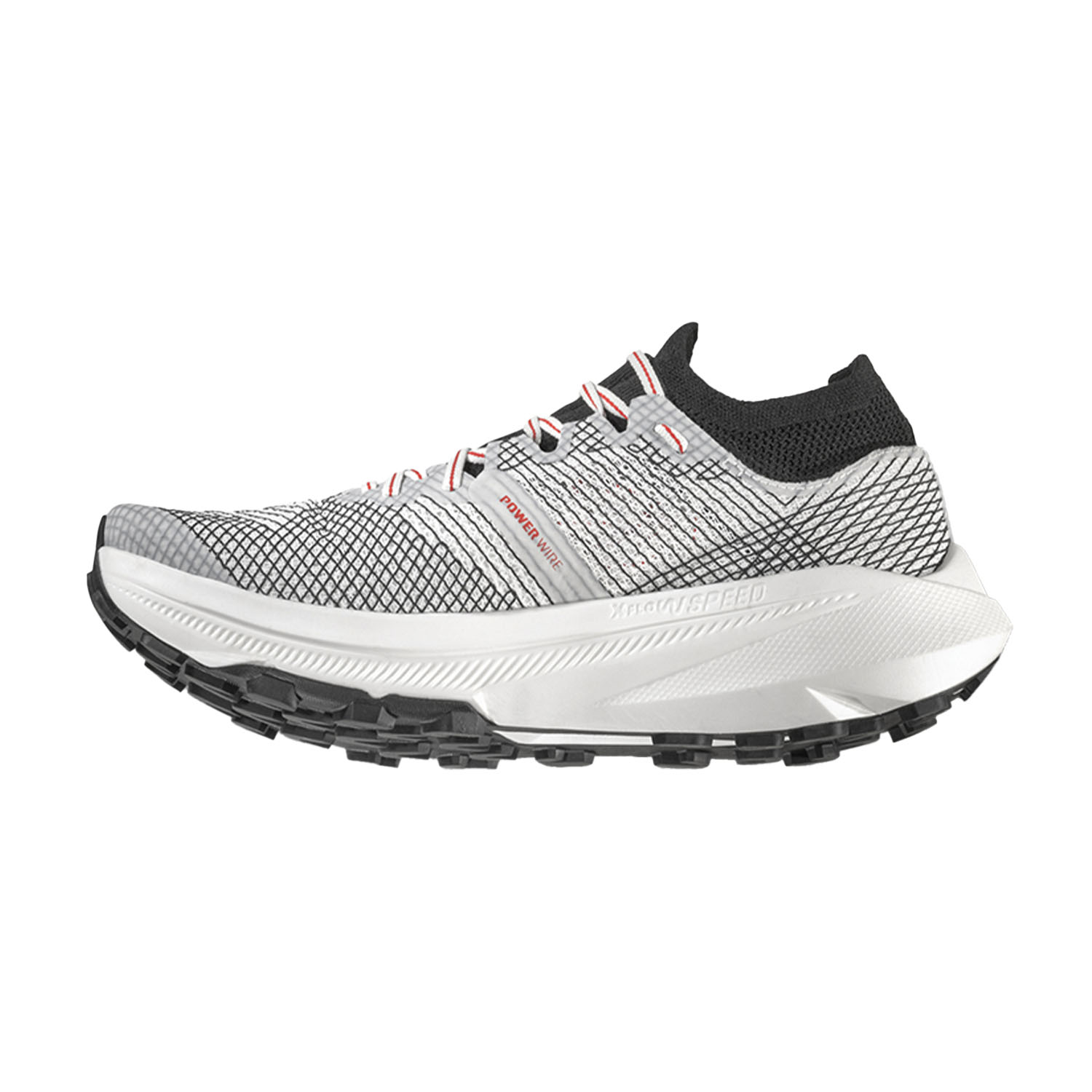 La tomaia Power Wire, leggera, traspirante e confortevole, è dotata di un sistema Wrapping System che avvolge il piede per garantire un fit preciso. I filamenti in TPU intrecciati e fusi sono altamente resistenti e aiutano ad immagazzinare energia e trasferirla dal tallone alla punta durante la falcata. L'intersuola XFlow Speed, realizzata al 100% con materiali riciclati, offre una spinta propulsiva che favorisce la velocità anche sui sentieri più impegnativi. Lo strato XFlow migliora l'assorbimento degli impatti al suolo, assicurando una maggiore protezione contro le asperità del terreno. La suola FriXion White ha una tacchettatura da 4 mm, studiata per garantire il massimo grip anche sui sentieri tecnici.